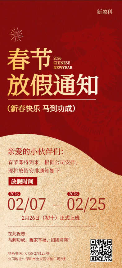 春节的脚步越来越近现将我司2026年春节放假安排通知如下: 本次春节放假时间为: 2026.02.7-2026.02.25请大家合理安排放假时间,深圳市新盈科企业管理咨询有限公司祝大家新年快乐!